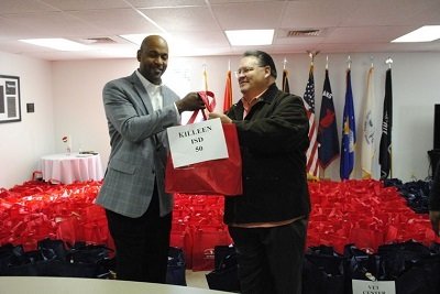 Copperas Cove and Killeen city council members joined representatives from state government offices, Cove Independent School District Superintendent Joe Burns, KISD Deputy Superintendent DesMontes Stewart, SG-VHV Premier Sponsors from Century 21/JR Rentals & Property Management and The Car Wash Barn as well as plenty of volunteers at the SG-VHV office in Copperas Cove to hand out the bags. (Seated at the table on photo)